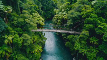 Aerial view of a suspension bridge crossing a lush river in a tropical forest