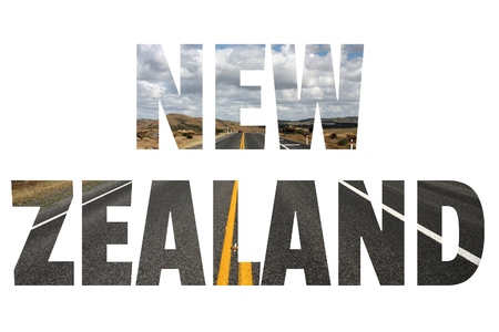 New Zealand - country name sign with photo in background. Isolated on white.