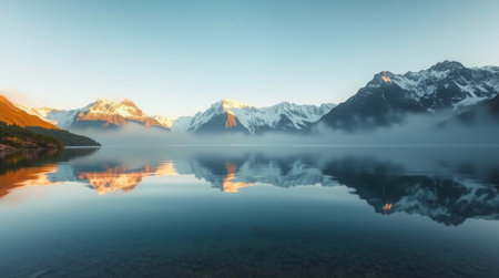 A breathtaking view of snow-capped mountains reflected in a calm lake at sunrise, surrounded by mist and soft pastel colors for a tranquil experience.