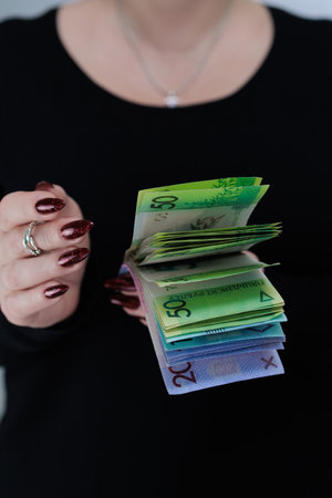 Savings, or Investment Hand full of New Zealand Bank Notes Fifties, Twenties and Tens Selective Focus with Copy Space
