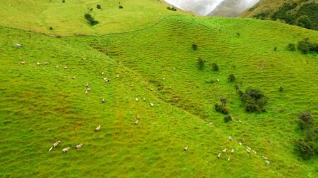 Rural area full of green hills and sheep on a sunny day. New Zealand
