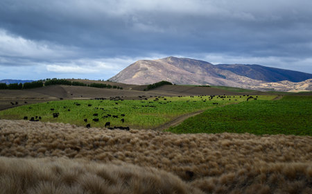 Black cattle grazing on the green farmland. Tongariro. North Island. New Zealand.