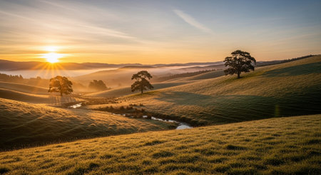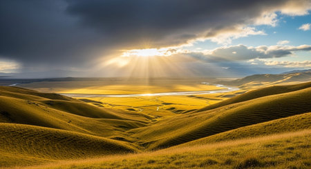 Golden hour soft light sun rays backlight rolling hills green grass farm meadow pasture mountain landscape at Kaihoka Lakes Tasman South Island New Zealand