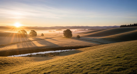 Sunrise over a river in the countryside of South Island New Zealand