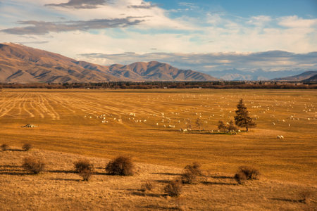 Beautiful autumn scenery with clear skies and green mountains in sheep farms in the South Island, New Zealand.