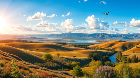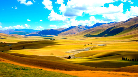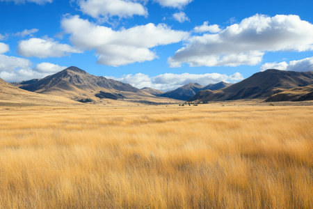 A vast grassland filled with golden hues stretches between majestic mountains on a bright sunny day.