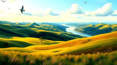 Beautiful landscape with hills and river at sunset. 3d rendering