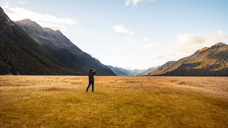 A tourist holding camera taking photo at the view point of Ellington Valley while travelling along the road trip to Milford sound, scenic of vast meadow with beautiful mountain ranges at the back with blue sky as a background.