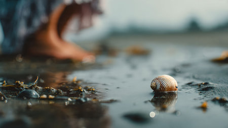 A stunning scallop shell rests on calm water, creating a beautiful reflection. This serene coastal scene captures the essence of nature