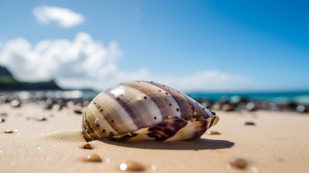 Captivating image of a beautifully detailed shell resting on soft sand, set against a clear blue sky and gentle clouds, ideal for nature and coastal themes.