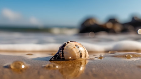 A beautiful shell rests on the beach, kissed by gentle waves at sunrise. Captured in a serene landscape, the image conveys tranquility and the beauty of nature.