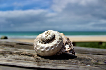 Fibonacci Spiral, Seashell, Spiral Growth, Sandy Beach, Clear Sky, Realistic, Backlights, Lens Flare, Macro shot