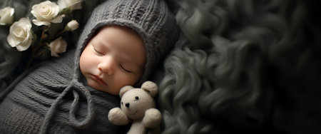 Cute newborn baby sleeping in a gray knitted hat with a teddy bear.