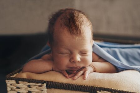 Cute newborn baby boy sleeping in a basket with a knitted cap