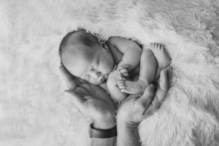 Feet of a newborn in the hands of a father, parent. Studio photography, black and white. Happy family concept.