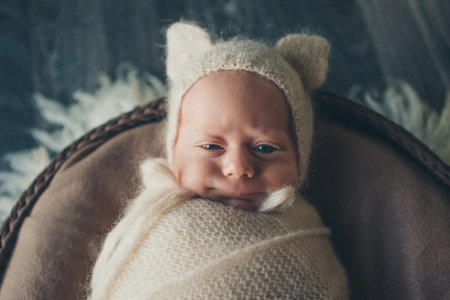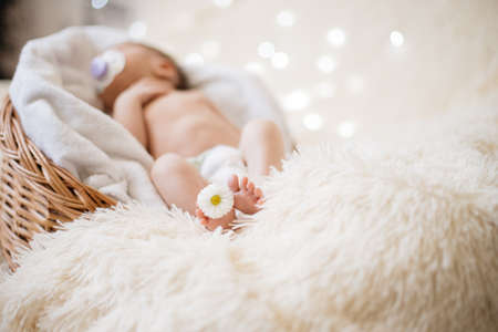 A newborn baby is wrapped in diapers with a wool cap in a basket. A mothers love for her child.