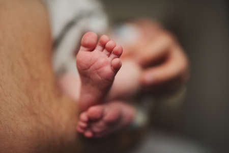mother holds in her hands the feet of a newborn baby . new life concept . adopt me please . selective focus .