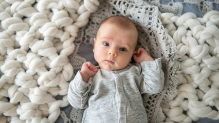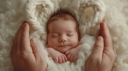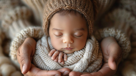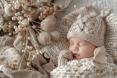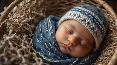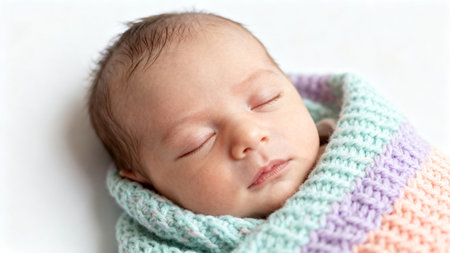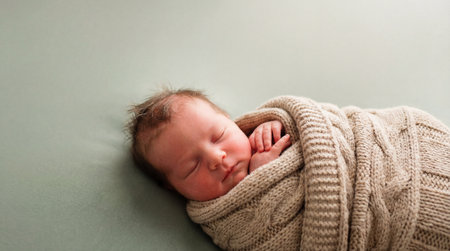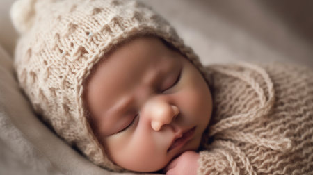 Sleeping newborn baby wrapped in cozy knitted blanket on soft pastel background, peaceful infant resting in warm swaddle.