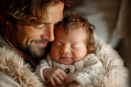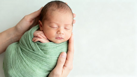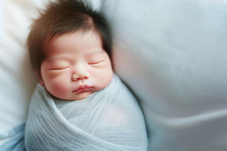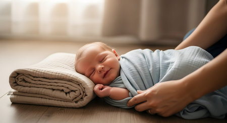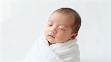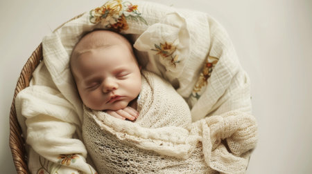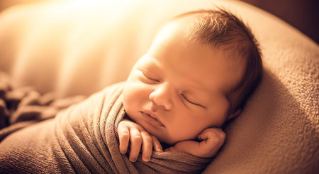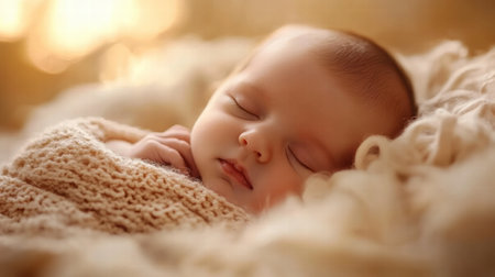 A peaceful newborn rests soundly, wrapped in a soft blanket, while warm golden light creates a tranquil ambiance around.