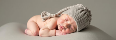 Newborn baby sleeping peacefully on a soft blanket, adorned with a cozy knitted hat, creating ample copy space perfect for banners and web design projects