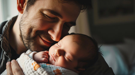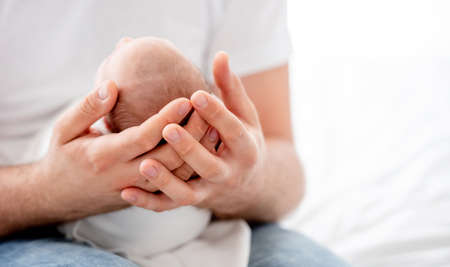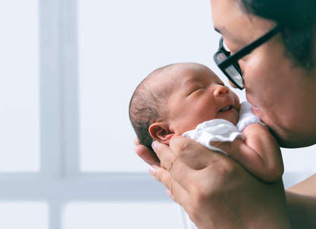 Close-up portrait of happy young father hugging and kissing his sweet adorable newborn child. Indoors shot,copy space for text.