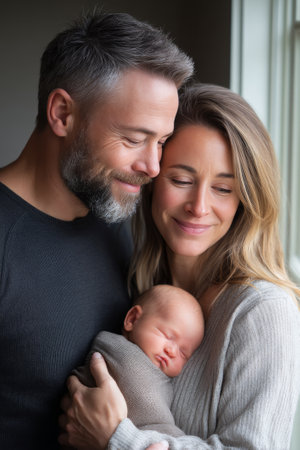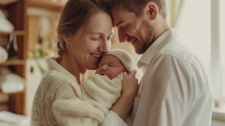New parents, beaming with joy, hold their sleeping baby close, bathed in gentle window light that accentuates their love and connection.
