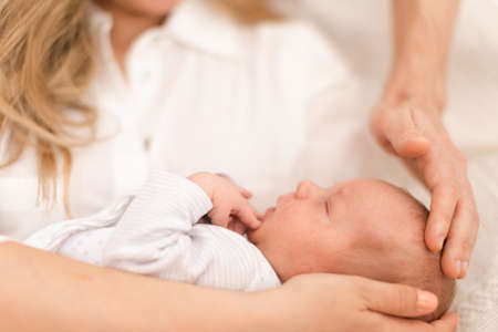 Little infant baby boy sleeping laying on mothers and fathers arms. Neutral black background, black and white picture. Happy family