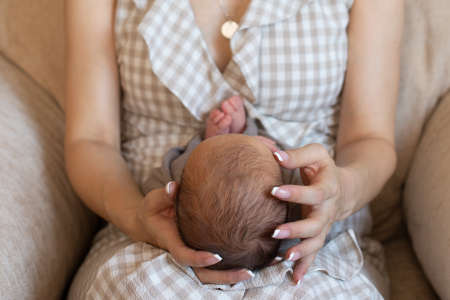 Close-up of a 2-month-old Asian newborn boy, undressed on his mother's lap. There is a mother who takes care of closely