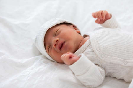 Top view happy newborn baby lying sleeps on a white blanket comfortable and safety.Cute Asian newborn sleeping and napping on bed.Newborn Baby photography concept
