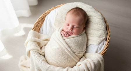 Newborn baby wrapped in warm blanket sleeping in wicker basket at home