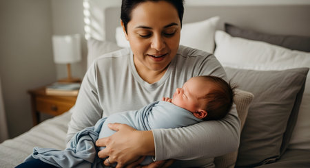 A smiling mother gently cradles her newborn baby, who is wrapped in a soft blue swaddle. The scene takes place in a cozy bedroom with natural light, capturing a moment of tender maternal connection.