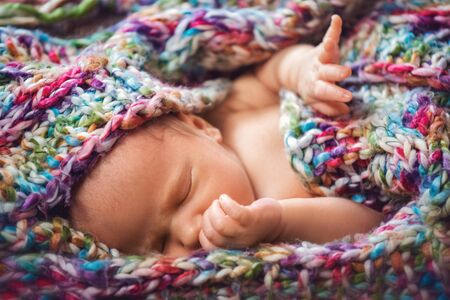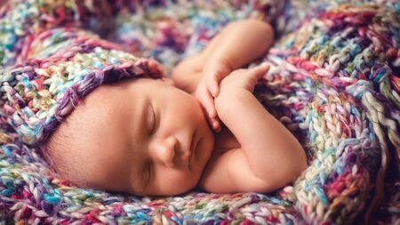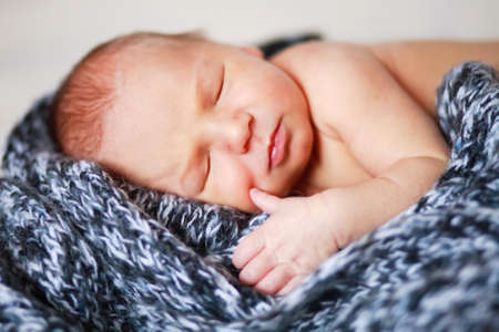 Newborn boy sleeping peacefully wrapped in knitted scarf. The concept of baby care and child care