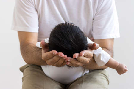 A picture of a youthful dad embracing his infant child. Parental affection lone papa father's celebration idea.