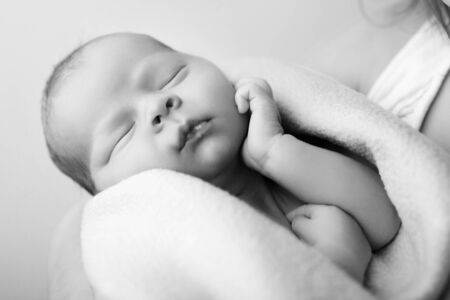 Cute newborn baby girl wrapped in white blanket lying and sleeping in her mom's arm