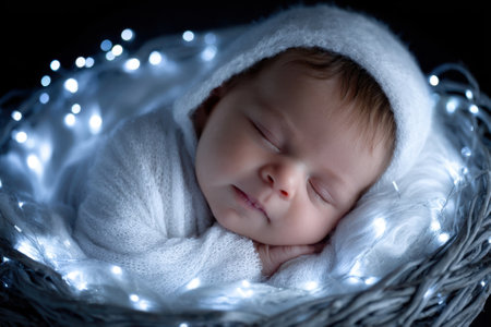 A tranquil newborn baby sleeps in a woven nest with twinkling lights, creating a serene atmosphere.