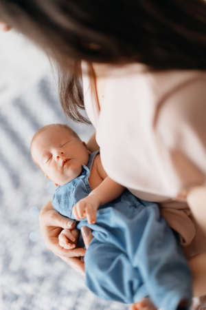 Mom gently holds a newborn baby in her palms. The first days of life, childrens emotions