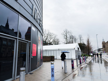 Manchester, UK - December 06, 2025: Rainy day in Manchester with a modern University building, white event tent, and people with umbrellas.
