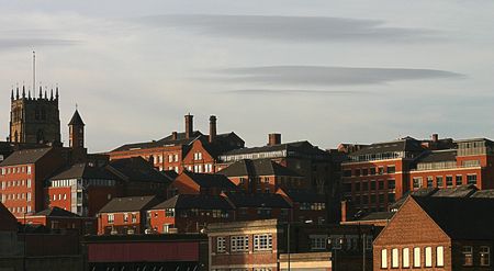 View of building roof tops in Leeds city center.