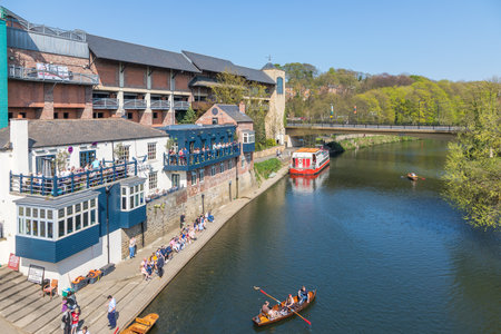 Durham, England, UK -22 April 2019: View of the Durham town. Brick houses on the Wear River. Boats on the river. spring season.