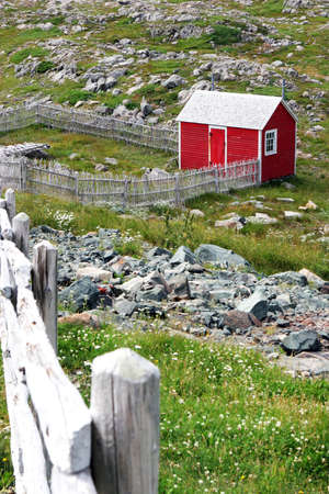 Rustic red building on the Bonavista Lighthouse grounds in Newfoundland, Nova Scotia, Canada - travel and tourism.