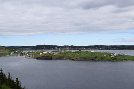 Small village and community buildings in Twillingate, Newfoundland. Homes along shoreline in this coastal village, local roads connect the community along the Island's edges.