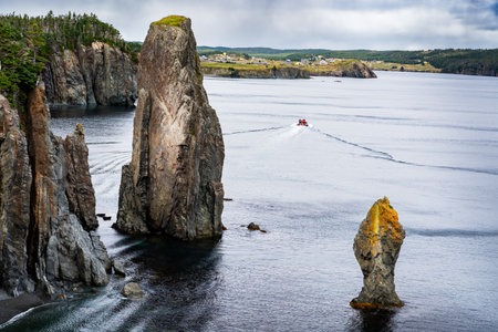 A tour boat travelling near high rocky cliffs along the Skerwink hiking trail on the East Coast of Canada near Port Rexton Newfoundland.