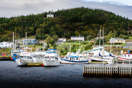 Dildo Newfoundland Canada, September 26 2022: Harbour view of a small tourist destination and port with a large town sign on a hillside.