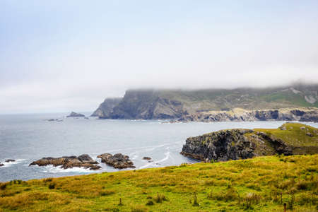 Rugged landscape at Malin Head, County Donegal, Ireland. Beach with cliffs, green rocky land with sheep on foggy cloudy day. Wild Atlantic Way region.