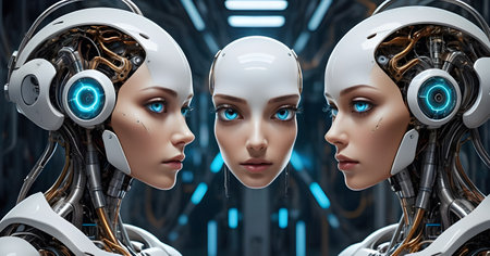 An AI generated illustration of three robotic female figures with metallic wiring and circuitry connected to them against a dark background
