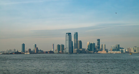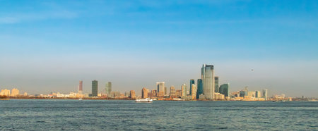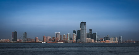 Panoramic view of New Jersey from the ferry arriving in Manhattan, USA. Upper Bay and the skyscrapers of New Jersey on the banks of the Hudson River at sunrise.