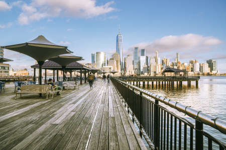 JERSEY CITY, NEW JERSEY-MARCH 8 - A scenic view of the Newport section of Jersey City along the Hudson River waterfront as seen on March 8 2017 in New Jersey.