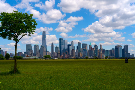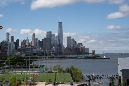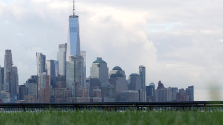 New York City waterfront skyline, Manhattan Downtown World Trade Center building riverfront skyscraper. Waterside cityscape from Pier A Park, New Jersey Hoboken. United States architecture, grass lawn