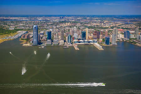 Aerial panoramic city view of New Jersey City financial Downtown skyscrapers. Birds eye view from helicopter. Jersey city is an important transportation center for the Port of New York and New Jersey