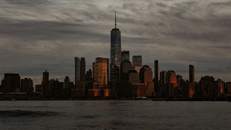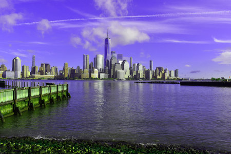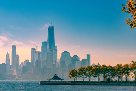 One World Trade Center. WTC memorial. Lower Manhattan view. View from New Jersey. New York City skyline. New York skyline of World Trade Center.
